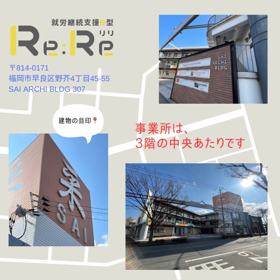 福岡県福岡市早良区野芥にある障がい福祉サービス「就労継続支援B型 Re:Re(リリ)」の事業所紹介です。事業所の外観や内観、設備や作業・訓練風景等を写真でご紹介しています。