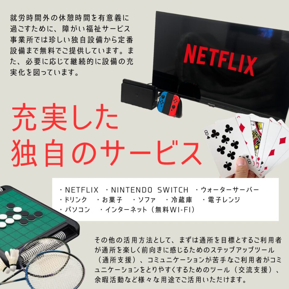 福岡県福岡市早良区野芥にある障がい福祉サービス「就労継続支援B型 Re:Re(リリ)」の事業所紹介です。事業所の外観や内観、設備や作業・訓練風景等を写真でご紹介しています。